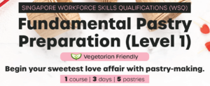 Aspiring to be a pastry chef but don’t know what is the chemistry between butter and sugar, or when to use a whisk and a spatula? This is the perfect course for you! In this WSQ certified fundamental pastry preparation course, you will gain a solid understanding of the different baking ingredients, tools and equipment, know the fundamentals of pastry-making principles and importance of weighing formulations. With step-by-step guidance, you will also learn foundational pastry techniques on knife handling and piping methods to make delicious and good-looking pastries ranging from rustic pumpkin pie to pretty icing cookies.